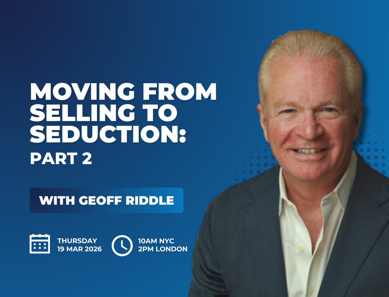 About Geoffrey Riddle: Geoff Riddle is a luxury market speaker, author, and strategist with over 2,000 presentations and 30+ years of professional experience. He has served as President of the Philadelphia chapter of the National Speakers Association, Regional Advisor, and co-founder of its Sales Professional Group. Acclaimed as one of the TOP Luxury Speakers in the World by the World Luxury Chamber of Commerce, Geoff specializes in boosting sales by refining existing processes into award-winning performances. With $100 million in personal sales and decades of face-to-face selling expertise, he teaches strategies inspired by screenwriters and actors to captivate audiences. His insights appear in national and international publications.